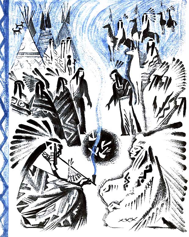 Три дня после их возвращения прошли в нетерпеливом ожидании, а на четвёртый всё племя в самых лучших нарядах собралось у вигвама Белого Пера. В полдень наберегу реки встретились два племени…