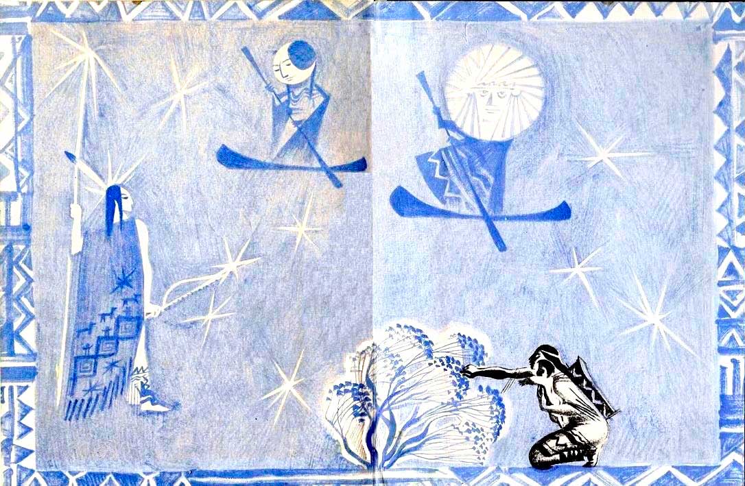 Недолго думая Кирики ухватился за толстый зелёный стебель и полез. Он лез, лез и, наконец, очутился так высоко, что, глянув вниз, не увидел своего вигвама. Кирики испугался и хотел было спуститься, но тут наверху что-то неожиданно блеснуло. «Что там такое?» — подумал он и решил подняться выше.