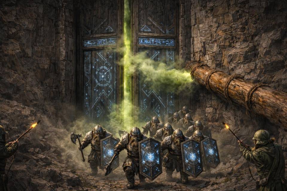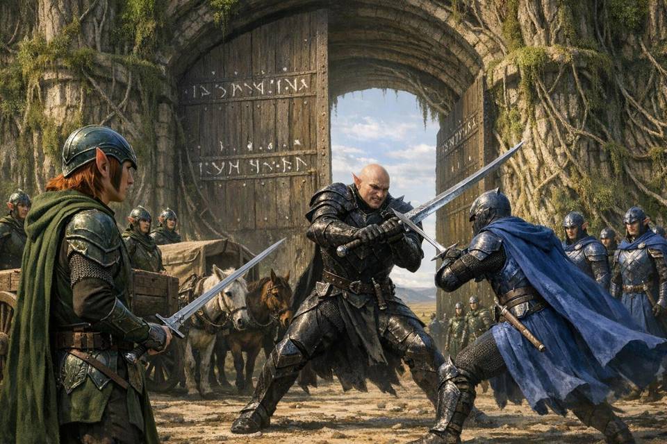 Шесть стражников Магистрата в коричневых доспехах стояли у ворот дома в две шеренги по трое, и у каждого в руках был тяжёлый эльфийский лук. Но что важнее — их взгляды. Они больше не смотрели на меня, как на героя, привёзшего зерно. Они смотрели на меня как на угрозу. Я обернулся к Вариону, который вместе с тремя «синими плащами» сопровождал нас: