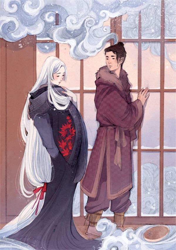 Обычно ее видят ночью в снежных горах: ледяное дыхание, кожа такая бледная, что кажется прозрачной, длинные волосы, запорошенные снегом. По некоторым поверьям, у нее нет ног и она беззвучно скользит в своем белом кимоно по белоснежному покрову. Так часто описывают Юки-онна («снежную женщину») – сверхъестественного персонажа японской мифологии. Есть множество вариантов легенд о ней – столько же, сколько форм снежинок. Во многих из них отмечается ее жестокость: появление Юки-онна сулит верную смерть тому, кто встретит ее на пути. Однако в некоторых поверьях, хотя и гораздо реже, это ледяное существо способно испытывать эмоции. Мне захотелось изучить эту менее известную ее сторону. Она вдохновила меня сделать Юки-онна главной героиней моего рассказа. Многие ёкаи – «чудовища» из японской мифологии – были не просто сверхъестественными существами, но связывались с настоящими явлениями природы. Ведь на самом деле они часто рождались из человеческой необходимости понять необъяснимые вещи и создать связь между чудесным и естественным. Если говорить о связи персонажа с определенной стихией и явлениями природы, то Юки-онна, о которой мне захотелось рассказать, унаследовала все свойства снега: не только пагубные для человека, но и такие, как хрупкость и недолговечность. Подобно зиме, Юки-онна приносит с собой тишину и тайны и окутывает будничный пейзаж совершенно иной атмосферой. Образ дровосека довольно часто появляется в легендах, связанных с Юки-онна. В глухом лесу вдали от цивилизации дровосеки встречаются с духами снега и, очарованные видом, порой становятся их жертвой, как будто само погружение так глубоко в природу таит для человека смертельную опасность. Но мне было интересно описать другую судьбу, поэтому главный герой этой сказки по своему характеру замкнут и далек от суеты деревни. Среди гор ему комфортнее, чем среди людей. Именно это делает его ближе к стихии и к духу снега, воплощенному в прекрасной девушке.