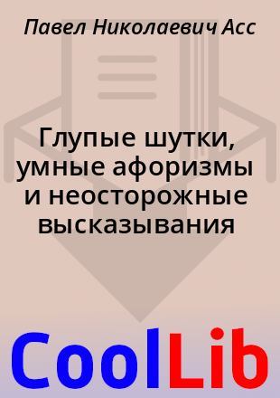 Асс Павел Николаевич & Бегемотов Нестор Онуфриевич Глупые шутки, умные афоризмы и неосторожные высказывания Павел Асс Глупые шутки, умные афоризмы и неосторожные высказывания - Друг человека, а они его в намордник! - От каждого по способностям, каждому по-фигу! - Один ум - хорошо, если ума - палата. - Стакан самогона с содовой. - Женщина была такая лапушка... А мужчина - лопух! - У вас в бронепоезде есть вагон-ресторан? - Подарили коня без зубов. - Цент доллар сбережет. - Накурился, хоть противогаз вешай. - Годяям все вдомек. - Не все дураки - Иваны. Бывают и Михаилы, и Борисы... - Если пресветлый эмир - дурак, то надо стараться быть Ходжой Насреддином. - Если не вставить сюда эту пошлость, то будет совсем неприлично! - Выбивают дурь из головы, а бьют почему-то по заднице! - Я ни разу в жизни человека не бил. А те, кого бил, ну, разве это были люди? - Это был тонкий а ...