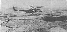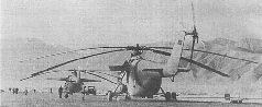 Уже в первые месяцы боевых действий экипажи Ми-6 приступили к выполнению задач, ставших главной работой подразделений тяжелых вертолетов, - транспортировке боеприпасов, вооружений, топлива, медикаментов и других грузов на небольшие площадки отдаленных или блокированных моджахедами гарнизонов. Большие габариты грузовой кабины вертолета позволяли перевозить артиллерийские орудия, минометы и автомобили, но особенно много приходилось доставлять продуктов, как говорится, своих кормили. Для этих целей в Кундузе имелся даже специально приспособленный для. транспортировки мяса Ми-6-холодильник. Одним из мест, куда приходилось постоянно летать, было селение Бамиан в 130 км северо-западнее Кабула. Снабжение стоявших там войск велось исключительно по воздуху и требовало чуть ли не ежедневных вылетов. Среди других постоянных пунктов назначения были Лашкаргах, Чагчаран, Турагунди. За один рейс даже в условиях летней жары и высокогорья с помощью Ми-6 удавалось доставить 4-4,5 т грузов, что в 2-3 раза превышало возможности Ми-8. Зимой загрузка возрастала до 6-7 т. Душманы быстро поняли значимость авиационных перевозок и уже в первый год войны использовали различные способы противодействия, в том числе и диверсии. Так, им удалось заминировать грунтовую полосу в Лашкаргахе, и при посадке на нее в 1981 г. подорвался и сгорел Ми-6 к-на Пупочкина, став, очевидно, первой машиной этого типа, потерянной в той войне. К счастью, все члены экипажа остались живы.