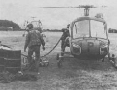 Straight from the can! Basic Scout AH.1 helicopter refuelling at the Commando Air Squadron forward operating base at Teal Inlet