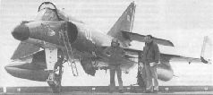 Фюзеляж – полумонокок овального сечения. Летчик размещается в брониро- ¦ ванной гермокабине, фонарь которой от-: кидывается вверх-назад. Для аварийного покидания служит катапультное кресло Martin-Baker SEMMB CM4A. На машине установлен бесфорсажный ТРД SNECMA ATAR 8K50 с максимальной тягой 5160 кгс. Топливо размещается в крыльевых и фюзеляжных баках общей емкостью 3270 л. Возможна подвеска одного 625 л подфю-зеляжного и двух 1100 л подкрыльевых ПТБ. Самолет может дозаправляться в воздухе при помощи убирающейся штанги, установленной в носовой части фюзеляжа. Бортовое радиоэлектронное оборудование «Супер Этандара» включает инерционную навигационную бомбардировочную систему фирмы SAGEM (на аргентинских – ULISS 80), моноимпульсную многофункциональную РЛС AGA, систему индикации на лобовом стекле VEM 130 или VE 120 (на аргентинских), цифровой вычислитель воздушных данных Туре 66 и пр.