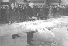 О. К. Antonov is breaking a bottle of champagne upon towbar of the first AH-124 before solemn aircraft's roll-out