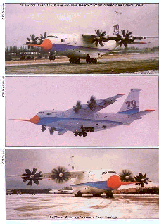 Ан-70 - первый в мире самолет с винтовентиляторными двигателями, поэтому специалисты АНТК особое внимание уделили силовой установке. Электронный борт «семидесятки», обладающий наиболее развитыми потенциальными возможностями среди ее аналогов, также потребовал значительных усилий. 24 ноября началась серия рулежных испытаний, в которых проверялись ходовые качества самолета, его управляемость при движении по земле и работа тормозов. Скоростные пробежки до момента отрыва переднего колеса доказали удовлетворительную эффективность аэродинамических органов управления.