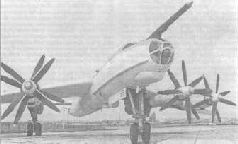 В поисках выхода из создавшегося положения Туполев полетел в Куйбышев к Кузнецову. В результате ОКБ-276 срочно спроектировало и изготовило двига-тель-спарку из двух ТВ-2Ф, работающих на общий редуктор. Новый ТВД получил обозначение 2ТВ-2Ф, а его суммарная мощность достигла 12000'э.л.с. Самым сложным в этой работе оказалось создание редуктора, не имевшего аналогов в мировой практике. Не имела аналогов и реализация подобной мощности с помощью воздушного винта. По первым прикидкам его диаметр превышал 7 м, что было явно неприемлемо по компоновочным соображениям. Выход нашли в использовании двух соосных винтов меньшего диаметра с противоположным вращением, спроектировать которые взялось ОКБ-120 под руководством К.И.Жданова. К.п.д. винтовой установки должен был составить не менее 0,78-0,82, что также еще не достигалось в авиастроении.