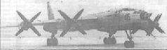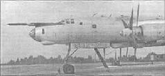 Для определения типа силовой установки бригада Кондорского проработала различные ее варианты: с четырьмя ТРД типа АМ-3; с четырьмя ТВД типа ТВ-10 и двумя АМ-3; с четырьмя ТВ-10 и двумя ТРД типа ТР-ЗА; с четырьмя ТВД типа ТВ-4 и двумя АМ-3; с четырьмя ТВ-10. В ходе поисков площадь крыла изменялась от 274 до 400 м2, удлинение -от 6,8 до 11,75, углы стреловидности - от О до 45'. Для окончательного сравнения выбрали два близких варианта: один с четырьмя ТРД, другой - с четырьмя ТВД. Расчеты показали, что наиболее приемлемым для получения дальности полета свыше 13000 км являлся вариант с четырьмя ТВД мощностью 12000-15000 э.л.с. и удельными расходами на крейсерском режиме порядка 0,25 кг/э.л.с. в час. При этом взлетная масса самолета достигала 200 т, расчетная максимальная скорость на высоте 10000 м - порядка 800 км/ч, длина разбега - 1500 м. Аналогичный самолет с четырьмя ТРД тягой по 9000 кгс (например, с АМ-3) имел бы в лучшем случае максимальную дальность не более 10000 км и длину разбега свыше 2000 м. Его единственным преимуществом была бы максимальная скорость более 900 км/ч. Изучив результаты исследований и понимая, что главное -это долететь до цели, Туполев окончательно выбрал для нового самолета силовую установку с ТВД, хотя руководители авиапрома и командование ВВС, ознакомившись с проектом Мясищева, настаивали на использовании ТРД.