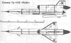 Ту-143 "Рейс" выполнен по аэродинамической схеме "утка" с неподвижным дестабилизатором. Носовой модуль фюзеляжа может отстыковываться и храниться отдельно. В зависимости от типа решаемых разведзадач в этом модуле размещаются: аэрофотоаппарат ПА-1 (позволяет с высоты 500 м выполнять снимки, на которых идентифицируются предметы размером от 20 см), либо телекамера "Чибис-Б", либо аппаратура радиационной разведки "Сигма". В средней части фюзеляжа установлены блоки автоматической системы управления АБСУ-143, до-плеровский измеритель скорости и сноса ДИСС-7, радиовысотомер малых высот А-032, агрегаты электрооборудования и носовая опора шасси. Маршевый двигатель ТРЗ-117 (вариант ТВлДТВЗ-117), развивающий на взлете тягу 640 кгс, находится в хвостовой части фюзеляжа. Тут же располагаются агрегаты топливной и гидравлической систем. Вокруг канала воздухозаборника организован топливный бак емкостью 190 л. Далее, в специальном отсеке перед килем, находится в убранном положении пороховой двигатель мягкой посадки, а в отсеке под килем - основной посадочный парашют площадью 57,4 кв.м. Замыкает хвостовую часть контейнер с тормозным парашютом. Для обеспечения взлета под фюзеляж ВР-3 монтируется твердотопливный ускоритель, сбрасываемый после отработки.