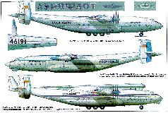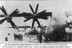 Новый ВТС планировалось оснастить четырьмя турбовинтовыми двигателями НК-12МВ разработки ОКБ Н.Д.Кузнецова, которые серийно выпускались Куйбышевским моторостроительным заводом №24 и устанавливались на Ту-95. Двигатели разместили на «сотке» так, что 45% площади крыла интенсивно обдувалось винтами, за счет чего несущие свойства крыла увеличились почти на 30%. Для получения заданных взлетных характеристик максимальной мощности НК-12МВ было вполне достаточно, однако применяемый на Ту-95 соос-ный воздушный винт АВ-60 диаметром 5,6 м был рассчитан на крейсерские режимы полета и имел стартовую тягу всего 8800 кгс. Для «сотки» требовался новый винт со стартовой тягой не менее 13000 кгс. Однако техпредложение по ВТ-22 и, следовательно, Постановление правительства о создании нового ВТС не предусматривали модернизацию двигательной установки. Поэтому Антонову стоило немало нервов убедить ГКАТ в необходимости этих работ - министерство боялось срыва серийного производства двигателей и винтов. При поддержке военных, ЦАГИ, ЦИАМ, разработчиков двигателя и винта упрямство чиновников было преодолено. ОКБ Жданова*, проведя совместно с ЦАГИ большой объем расчетных и экспериментальных исследований, разработало воздушный винт АВ-90 диаметром 6,2 м, а ОКБ Кузнецова адаптировало под него двигатель, присвоив ему обозначение НК-12МА. Была получена уникальная двигательная установка с максимальной тягой 14600 кгс и крейсерским расходом топлива 224 г/кВт ч, которая более 30 лет не имела себе равных.