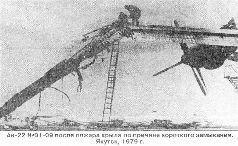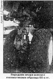 Требование обеспечить эксплуатацию столь тяжелого самолета с различных, в том числе грунтовых площадок, имеющих пониженную прочность поверхности (до 6 кгс/кв.см), определило применение многоколесного шасси с высокопрофильными пневматиками низкого давления. Проанализировав различные варианты, приняли следующую схему расположения основных опор шасси: друг за другом три двухколесные стойки по каждому борту фюзеляжа. Такая установка колес, помимо недостатков (неизбежное увеличение массы конструкции, неравномерное нагруже-ние стоек во время взлета и посадки, ухудшение управляемости самолета при рулении и др.), имеет и значительные преимущества. В частности, такое шасси обеспечивает плавное перекатывание через неровности ВПП и рулежных дорожек, его проще разместить в убранном положении. Применение рычажной подвески колес с вынесенными амортизаторами позволило получить большой ход амортизации при коротких стойках и, значит, максимально понизить уровень пола грузовой кабины над поверхностью аэродрома. На «сотке» предусмотрели не только одновременный, но и раздельный выпуск (уборку) основных стоек, что существенно повысило безопасность в эксплуатации. Впоследствии это было убедительно подтверждено, когда при неполном выпуске основного шасси Ан-22 успешно приземлялись на четыре стойки вместо шести. К примеру, в январе 1976 г. такую посадку произвела машина №06-09 (заводской №043483292), а в мае 1993 г. -«Антей» №05-06 (№033480228).* Была предусмотрена и возможность регулировки из кабины экипажа давления в пневматиках основных колес (от 2,5 до 5 кгс/кв.см) в зависимости от аэродромных и погодных условий, массы и центровки самолета, но опыт строевой эксплуатации Ан-22 не подтвердил необходимости такой системы, и она впоследствии была снята.