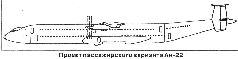 Однако работы по Ан-20 свернули и по указанию ГКАТ приступили к проектированию еще более тяжелого ВТС. Разработка техпредложения по этому самолету, получившему обозначение ВТ-22, завершилась в августе 1960 г. Самолет был рассчитан для перевозки грузов до 50 т на расстояние 3500 км, а также воздушного десантирования моногрузов до 15 т. ВТ-22 оснащался четырьмя ТВД НК-12МВ максимальной мощностью по 15000 э.л.с. Две из четырех основных стоек шасси убирались в мотогондолы внутренних двигателей, две другие - в обтекатели по бортам фюзеляжа. Крыло типа «обратная чайка» имело излом у внутреннего двигателя. Предусматривалась возможность его оборудования системой управления пограничным слоем. Габариты грузовой кабины позволяли этому самолету, в отличие от предыдущего проекта, решать задачу транспортировки практически всей боевой и инженерной техники, которую в то время военные желали перебрасывать по воздуху.