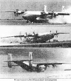 В течение следующего года большой объем летных испытаний посвятили изучению поведения Ан-22 при воздушном десантировании людей и грузов. В этих полетах участвовали три машины; №01-03 и №01-05 производили сбросы в Гостомеле, а №01-06 - на полигоне в районе Кедайняя (Литва). Вначале с высот 1500-2000 м сбрасывали манекены, макеты техники на парашютных платформах с примитивными бумажными и пенопластовыми амортизаторами (ра-кетно-парашютная система РПС, используемая в настоящее время для приземления десантных платформ, тогда только проходила испытания) и болванки массой до 20 т. Затем проводилось десантирование легких танков (15-18 т) с высот 800-1000 м. В результате основные вопросы воздушного десантирования с Ан-22 тяжелых грузов нашли свое решение. В частности, определили диапазон допустимых скоростей полета при сбросе - 310-400 км/ч. Было установлено, что в аварийной ситуации при остановке груза после его страгивания продолжение полета с последующей посадкой возможно при центровке самолета не более 36% САХ. Устойчивую работу вытяжных парашютов площадью 8-14 кв.м удалось обеспечить при длине стренги около 60 м. Поэтапно отработали и внедрили в эксплуатацию методику парашютного десантирования моногрузов массой до 20 т. Кстати, до настоящего времени эта масса является предельной для сброса даже с более тяжелого ВТС АН-124 «Руслан».