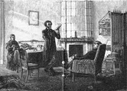 Впрочем, патриотические стихотворения не остались совсем без следа, и 14 ноября 1831 года Пушкин зачислен был на службу в ведомство Государственной Коллегии иностранных дел с жалованьем 5 тысяч ассигнациями в виде особенной высочайшей милости. Вместе с тем ему был дозволен вход в Государственные архивы для собирания материалов к истории Петра Великого, чем он и не замедлил воспользоваться в ту же зиму, по переезде с дачи в Петербург. Из квартиры своей в Морской отправлялся он каждый день в различные ведомства, предоставленные ему для исследований. Он предался новой работе с жаром, почти со страстью. Так протекла зима 1831 года. 7 января следующего года он был принят в число членов Императорской Российской Академии и начал прилежно посещать заседания Академии по субботам. Плодом этих посещений были статьи его “Российская Академия” и “О мнении М.А. Лобанова”. Весной 1833 года он переехал на дачу, на Черную речку, и отправлялся каждый день в архив, туда и обратно пешком; когда же чувствовал утомление, шел купаться, и этого средства было достаточно, чтобы снова возвратить ему бодрость и силы. В архивах Пушкин не ограничивался одним собиранием материалов к истории Петра; ему попалось случайно под руки несколько бумаг, относящихся к Пугачевскому бунту: он быстро увлекся изучением этого события и вскоре весь ушел в него. При такой непрерывной и страстной деятельности, к осени 1833 года у него были уже готовы материалы для “Истории Пугачевского бунта”, написана вчерне “Капитанская дочка”, и сверх этого были совсем отделаны “Русалка” и “Дубровский”.